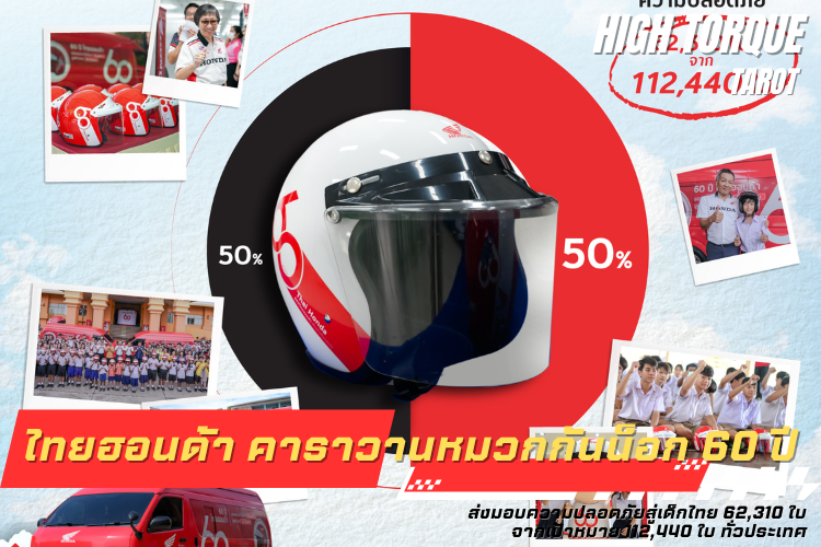 ไทยฮอนด้า ผู้ผลิตและจัดจำหน่ายรถจักรยานยนต์และเครื่องยนต์อเนกประสงค์ฮอนด้าในประเทศไทย เดินหน้าส่งต่อความห่วงใยสู่สังคมไทยในวาระครบรอบ 60 ปี ภายใต้โครงการรณรงค์ความปลอดภัยทางถนนระดับประเทศ “60 ปี ไทยฮอนด้า ขับขี่ปลอดภัย เพื่อสังคมไทยที่ยั่งยืน” ล่าสุด คาราวานหมวกกันน็อกไทยฮอนด้า ได้เดินทางมาถึง “ครึ่งทาง” ของภารกิจแล้ว ด้วยการส่งมอบหมวกนิรภัยมาตรฐาน…