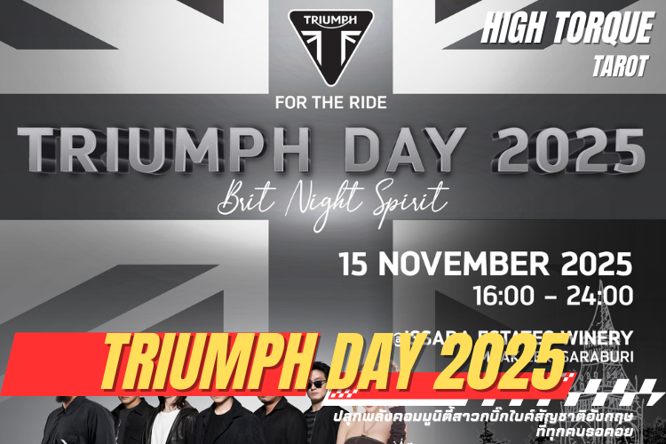 ล่าสุดไทรอัมพ์ได้เตรียมจัดงาน Triumph Day 2025 : Brit Night Spirit บิ๊กอีเวนต์แห่งปีที่เหล่าสุภาพบุรุษและสุภาพสตรีผู้หลงใหลในสไตล์อังกฤษ และความคลาสสิกของไทรอัมพ์รอคอย โดยผู้ร่วมงานจะสัมผัสประสบการณ์สุดพิเศษผ่านกิจกรรมมากมายทั้งการพบปะแลกเปลี่ยนประสบการณ์กับผู้ขับขี่ไทรอัมพ์จากทั่วประเทศ ดื่มด่ำไปกับความบันเทิงและเสียงดนตรีจาก Dax Rock Rider, Flure และ DJ Foamie ช้อปปิ้งสินค้าจากไทรอัมพ์และแบรนด์พันธมิตร ทั้งยังสนุกสนานไปกับเกมและจุดถ่ายภาพพร้อมรับของที่ระลึกให้เก็บเป็นความทรงจำ พร้อมเพลิดเพลินไปกับนิทรรศการรถจักรยานยนต์ไทรอัมพ์หลากหลายรุ่น ตลอดจนอร่อยไปกับอาหารและเครื่องดื่มจากร้านที่คัดสรรมาให้แบบเต็มอิ่มตั้งแต่ช่วงเย็นถึงเที่ยงคืนท่ามกลางบรรยากาศอันงดงามของไร่องุ่น