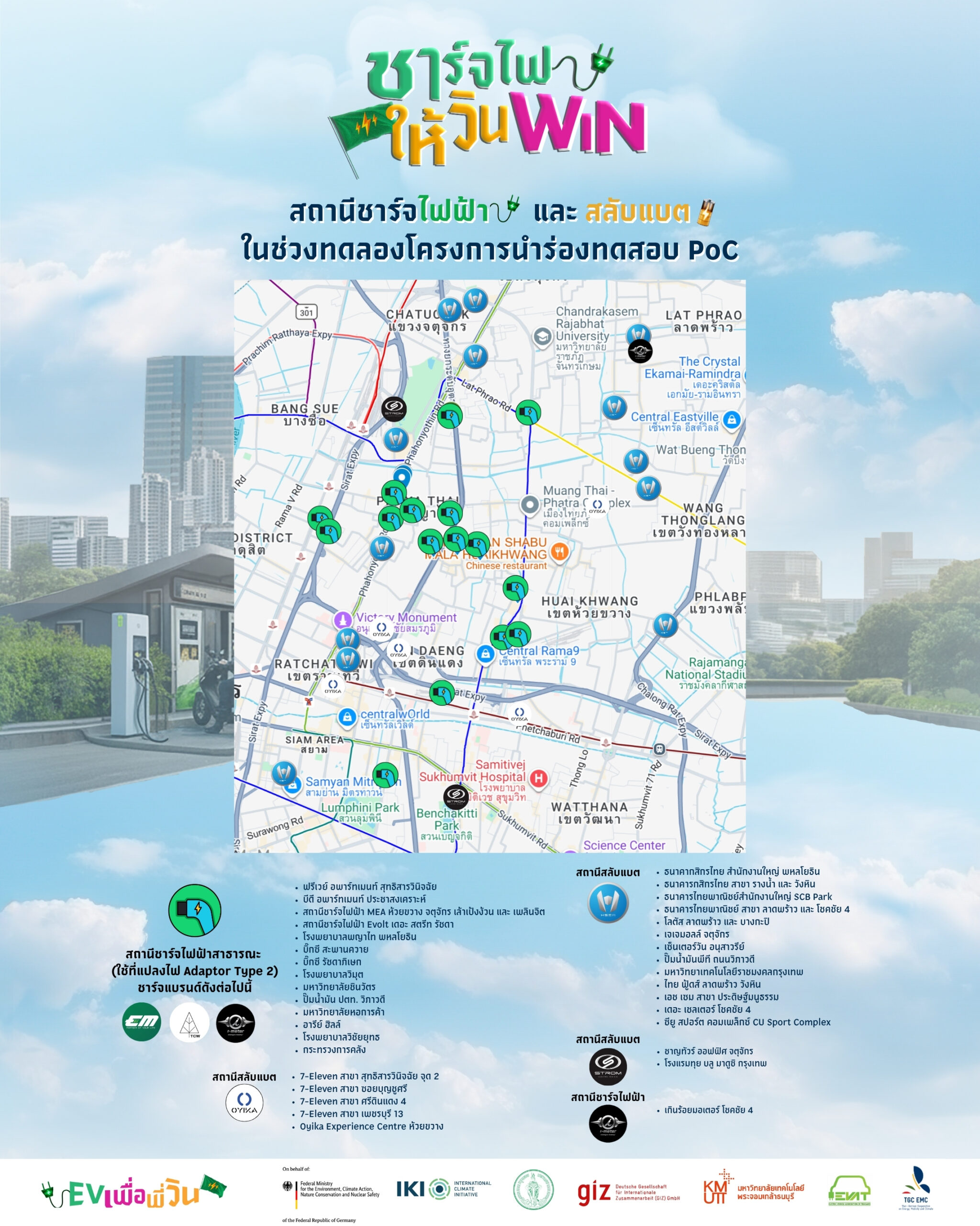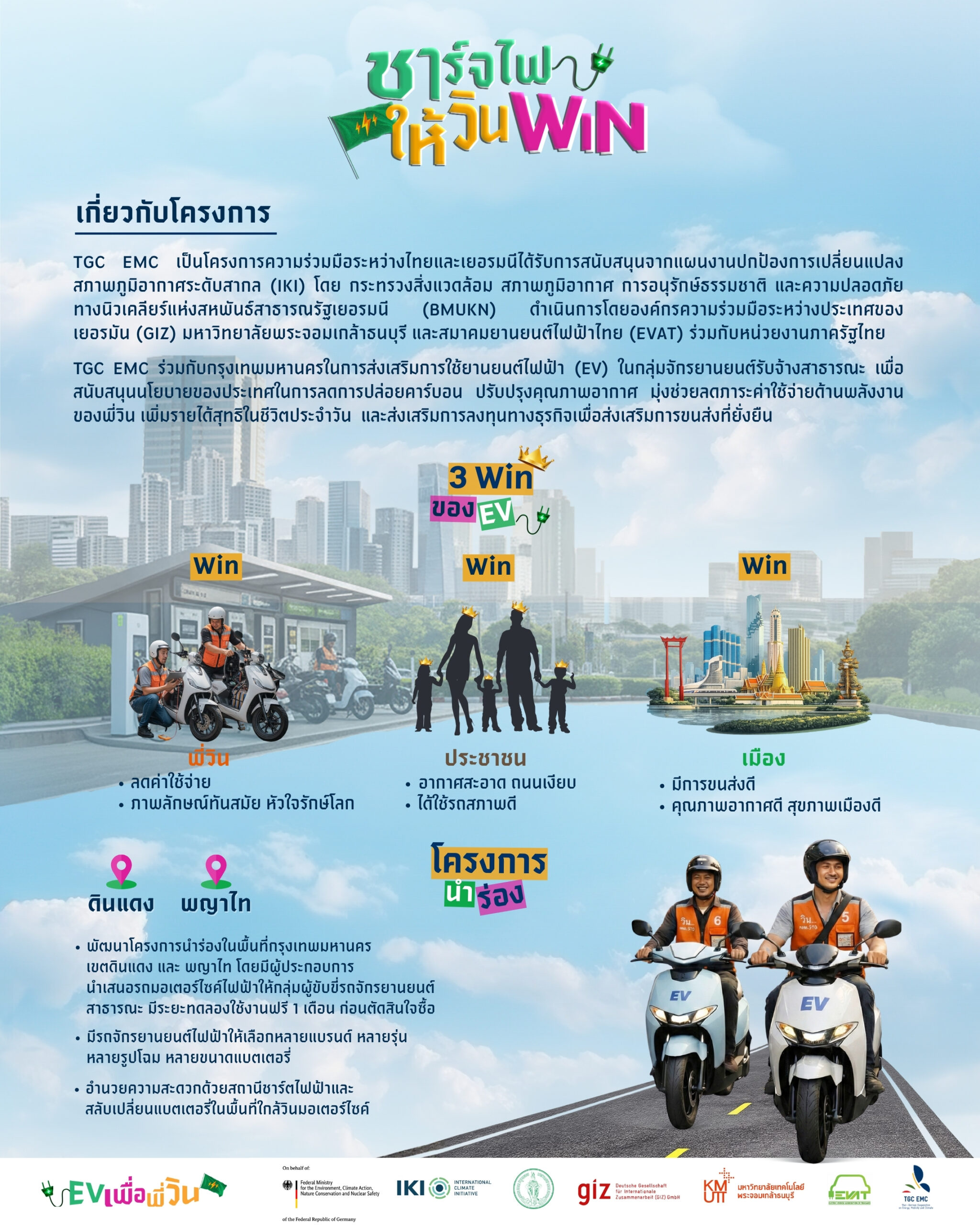 โครงการ “EV เพื่อพี่วิน” โดยกรุงเทพมหานครและ GIZ ร่วมกับมหาวิทยาลัยเทคโนโลยีพระจอมเกล้าธนบุรี และสมาคมยานยนต์ไฟฟ้าไทย (EVAT) ภายใต้โครงการ TGC EMC มุ่งเดินหน้าแก้ข้อจำกัดเชิงโครงสร้างเพื่อสนับสนุนให้ผู้ประกอบการวินมอเตอร์ไซค์หันมาใช้ยานยนต์ไฟฟ้า ผ่านการทดลองโมเดลเช่าขับในอัตรา 75-140 บาทต่อวัน ควบคู่กับการจัดเตรียมระบบอัดประจุทั้งแบบชาร์จและสลับแบตเตอรี่ที่ไม่ต้องรอชาร์จ พร้อมเปิดโอกาสให้ผู้ขับขี่วินมอเตอร์ไซค์และพนักงานกวาดถนนของ กทม. กว่า 200 คนในเขตดินแดงและพญาไท ร่วมทดลองขับและรับข้อมูลด้านต้นทุน การดูแลรักษา และระบบสนับสนุนที่จำเป็นต่อการทำงานจริง ก่อนคัดเลือก 30 คนให้ทดลองใช้งานต่อเนื่องเป็นเวลา 1 เดือนโดยไม่เสียค่าใช้จ่าย เพื่อเก็บข้อมูลเชิงลึกสำหรับการพัฒนาแนวทางขยายผลในระดับเมือง
