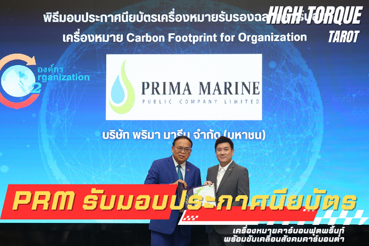 นายพชร รอดสมบูรณ์ ผู้จัดอาวุโสฝ่ายการเงินและนักลงทุนสัมพันธ์ บริษัท พริมา มารีน จำกัด (มหาชน) หรือ PRM เป็นตัวแทนบริษัทฯ รับมอบประกาศนียบัตรเครื่องหมายคาร์บอนฟุตพริ้นท์ขององค์กร (Carbon Footprint for Organizationหรือ CFO) จาก ดร.วิจารย์ สิมาฉายา ประธานกรรมการองค์การบริหารจัดการก๊าซเรือนกระจก (องค์การมหาชน) ณ ห้อง Conference Hall สถาบันเพื่อการยุติธรรมแห่งประเทศไทย (องค์การมหาชน) แจ้งวัฒนะ